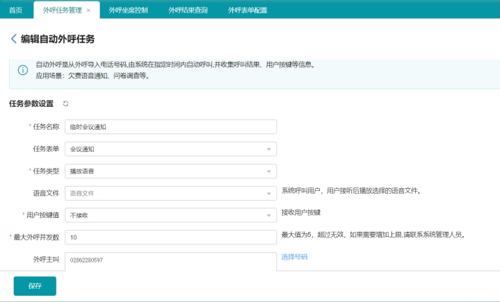 管理員按需創建外呼任務,選擇任務表單、任務類型(上傳錄音文件、上傳通知文本)、是否接受用戶按鍵(如:按1能參加,按2不能參加)、最大外呼并發數、外呼主叫(支持多主叫輪循)等,系統支持多任務并行工作。