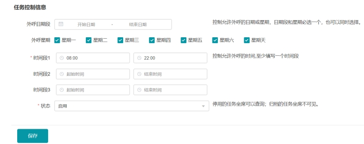 設置當前任務的生效日期/星期、允許外呼的時間段(避免騷擾,支持配置多個時段)、重呼次數(針對未接聽的)、重呼時間間隔(秒)、任務啟/停控制等。